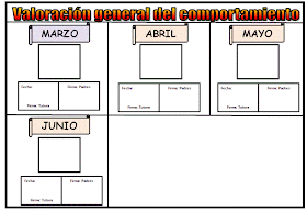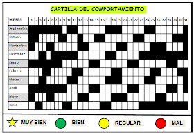 Éste trimestre tenemos novedades!!!!Como el primer trimestre fue tan estresante, me fue imposible elaborarles un registro del comportamiento a nivel oficial para los padres y estas vacaciones he aprovechado para realizar una "Cartilla del comportamiento" en la que se recoge en cada mes por días cómo se van portado y al final del mes se valora como ha sido el comportamiento general y esa cartilla se mandará a los padres para que me la firmen como constancia de que saben el comportamiento de sus hijos y es la mejor forma de que los padres vean la gran mejoría de sus hijos a nivel conductual en el aula a lo largo del curso escolar.