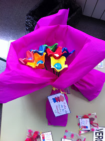 Como motivo del "día de la madre" mis niños del Aula Abierta han hecho con mucho cariño, con mi ayuda, este hermoso ramo de flores y un broche de libérula para sus madres.